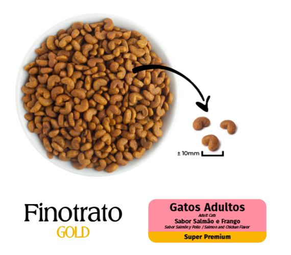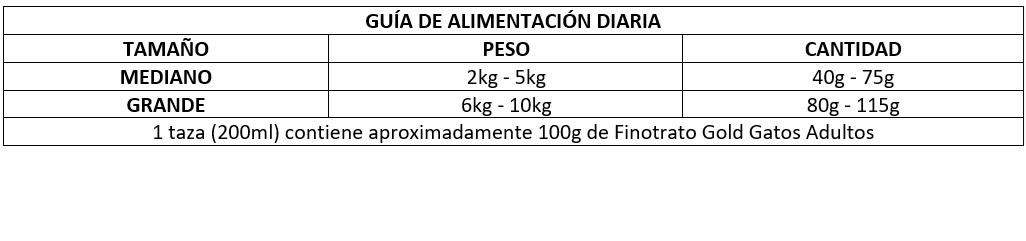 Harina de salmón, harina de vísceras de pollo, maíz integral molido, harina de chicharrones, harina de gluten de maíz 60, proteína concentrada de soya, levadura de caña de azúcar autolisada, pulpa de remolacha, celulosa, harina de alga, hígado de pollo hidrolizado, grasa de pollo, cloruro de sodio (sal común), cloruro de potasio, ácido cítrico, antioxidante (BHA y BHT), metionina, taurina, ácido propiónico, vitaminas (A, D3, E, B1, B2, B6, B12, K3, ácido nicotínico, ácido fólico, biotina, pantotenato de calcio y cloruro de colina), sulfato de hierro, sulfato de cobre, sulfato de zinc, yodato de calcio, selenito de sodio, sulfato de manganeso, óxido de zinc, bissulfato de sodio, cloruro de amonio, hexametafosfato de sodio, manano-oligosacáridos, bentonita, zeolita y extracto de Yucca schidigera.