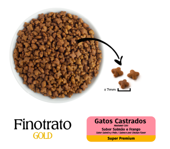 Farinha de salmão, farinha de vísceras de aves, milho integral moído*, farinha de torresmo, farelo de glúten de milho 60*, proteína concentrada de soja*, levedura autolisada de cana-de-açúcar, polpa de beterraba, celulose em pó, biomassa de microalga (Schizochytrium sp.), hidrolisado de fígado de aves, óleo de aves, cloreto de sódio (sal comum), cloreto de potássio, ácido cítrico, antioxidante (BHA e BHT), metionina, taurina, L-Carnitina, ácido propiônico, vitaminas (A, D3, E, B1, B2, B6, B12, K3, ácido nicotínico, ácido fólico, biotina, pantotenato de cálcio e cloreto de colina), sulfato de ferro, sulfato de cobre, sulfato de zinco, iodato de cálcio, selenito de sódio, sulfato de manganês, óxido de zinco, bissulfato de sódio, cloreto de amônio, hexametafosfato de sódio (0,1%), mananoligossacarídeo, bentonita, zeólita (1%) e extrato de Yucca (0,03%).