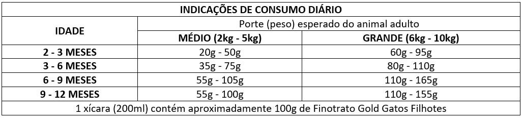 Umidade (máx) 90g/kg (9%), Proteína Bruta (mín) 350g/kg (35%), Extrato Etéreo (mín) 180g/kg (18%), Matéria Fibrosa (máx) 40g/kg (4%), Matéria Mineral (máx) 85g/kg (8,5%), Cálcio (mín) 8.000mg/kg (0,8%), Cálcio (máx) 15g/kg (1,5%), Fósforo (mín) 8.000mg/kg (0,8%), Sódio (mín) 2.500mg/kg, Potássio (mín) 6.000mg/kg, Magnésio (máx) 600mg/kg, Taurina (mín) 1.500mg/kg, Metionina (mín) 6.200mg/kg, Mananoligossacarídeos (mín) 500mg/kg, Ômega 6 (mín) 20g/kg, Ômega 3 (mín) 2.000mg/kg, DHA (Ácido Docosahexaenoico, mín) 1.000mg/kg, Energia Metabolizável 4.200kcal/kg.