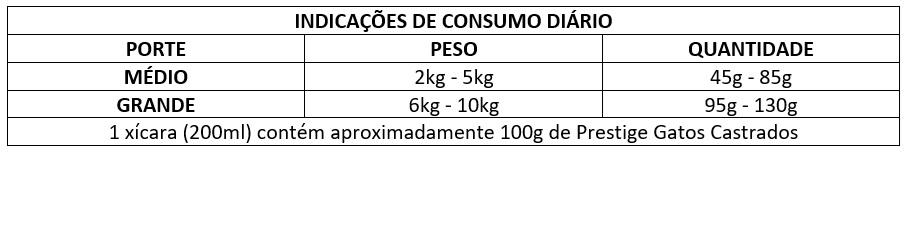 Umidade (máx) 90g/kg (9%), Proteína Bruta (mín) 300g/kg (30%), Extrato Etéreo (mín) 80g/kg (8%), Matéria Fibrosa (máx) 35g/kg (3,5%), Matéria Mineral (máx) 85g/kg (8,5%), Cálcio (mín) 8.000mg/kg (0,8%), Cálcio (máx) 18g/kg (1,8%), Fósforo (mín) 8.000mg/kg (0,8%), Sódio (mín) 4.000mg/kg, Taurina (mín) 1.000mg/kg, L-Carnitina (mín) 200mg/kg, Ômega 6 (mín) 12g/kg, Ômega 3 (mín) 800mg/kg, Zinco (mín) 80mg/kg, Vitamina E (mín) 40 UI/kg, Selênio (mín) 0,36mg/kg.